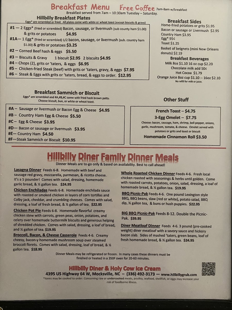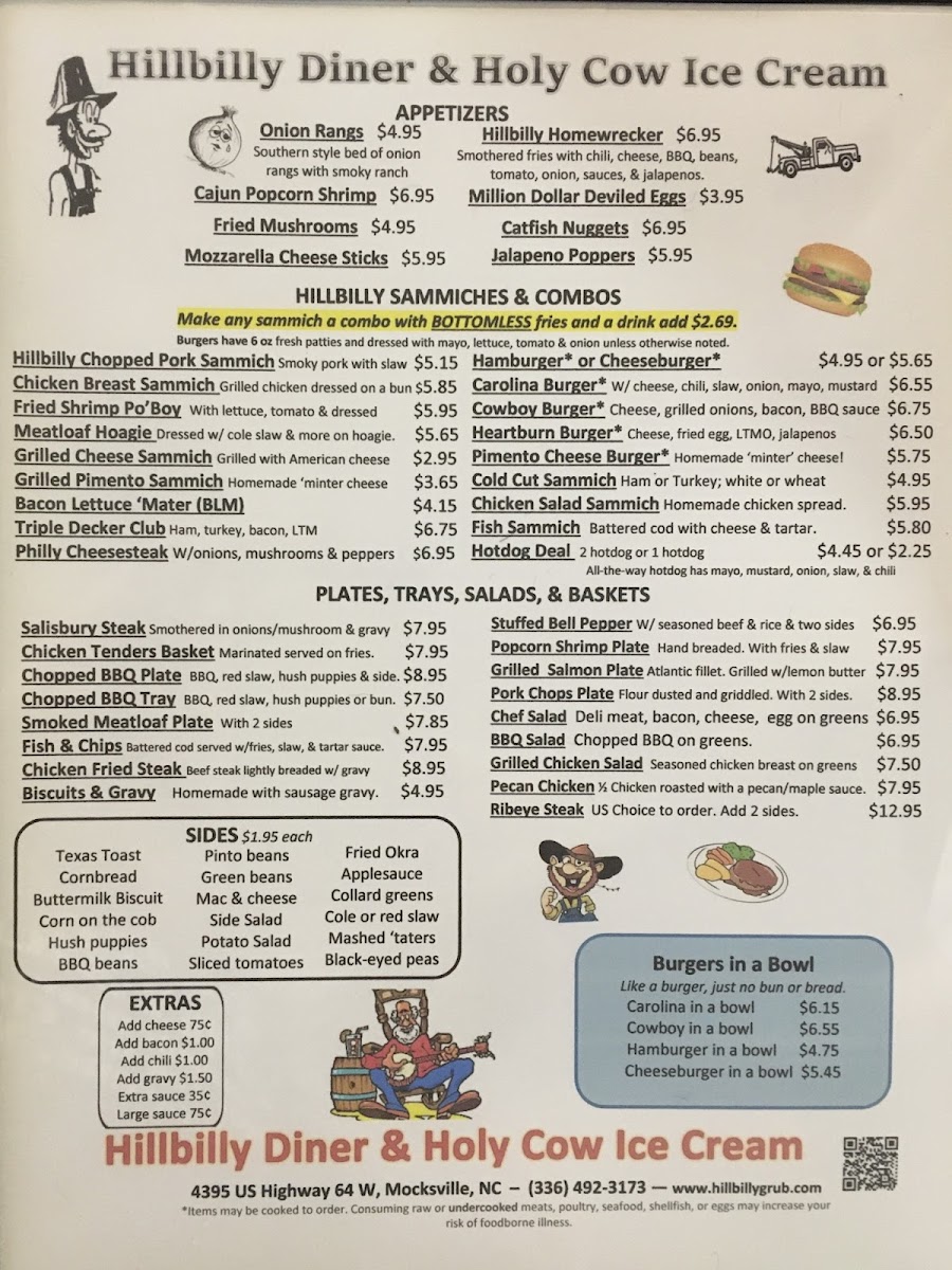 Welcome to Hillbilly Diner & Holy Cow Ice Cream, a charming eatery nestled in Mocksville, North Carolina, where hearty portions and warm hospitality reign supreme. This local favorite boasts a menu that gives a heartfelt nod to Southern comfort food.