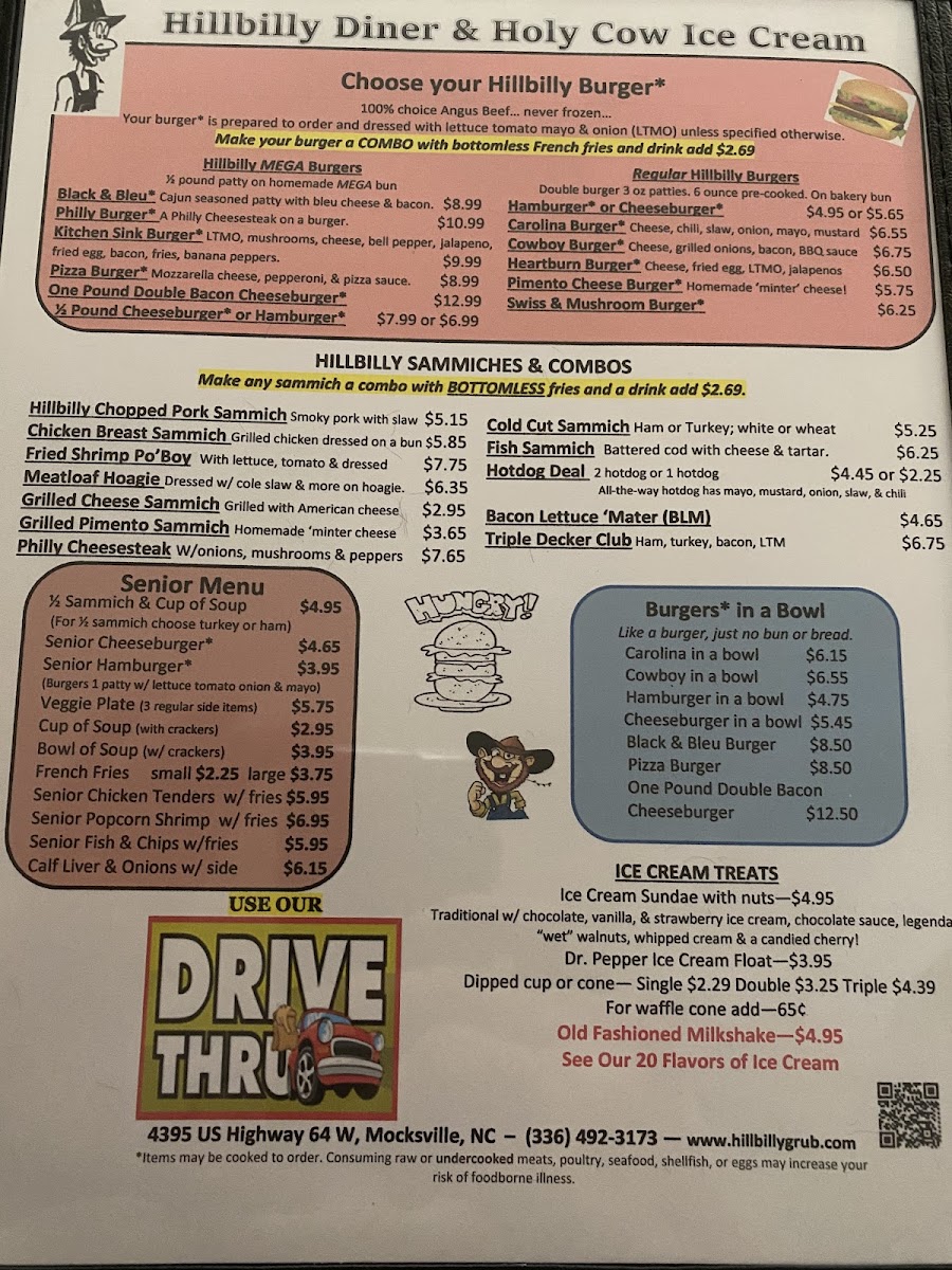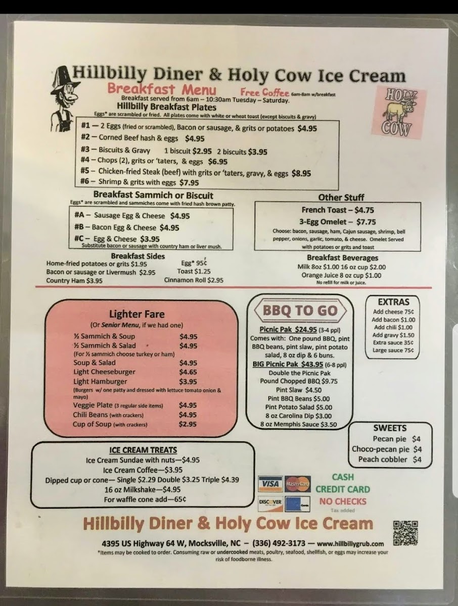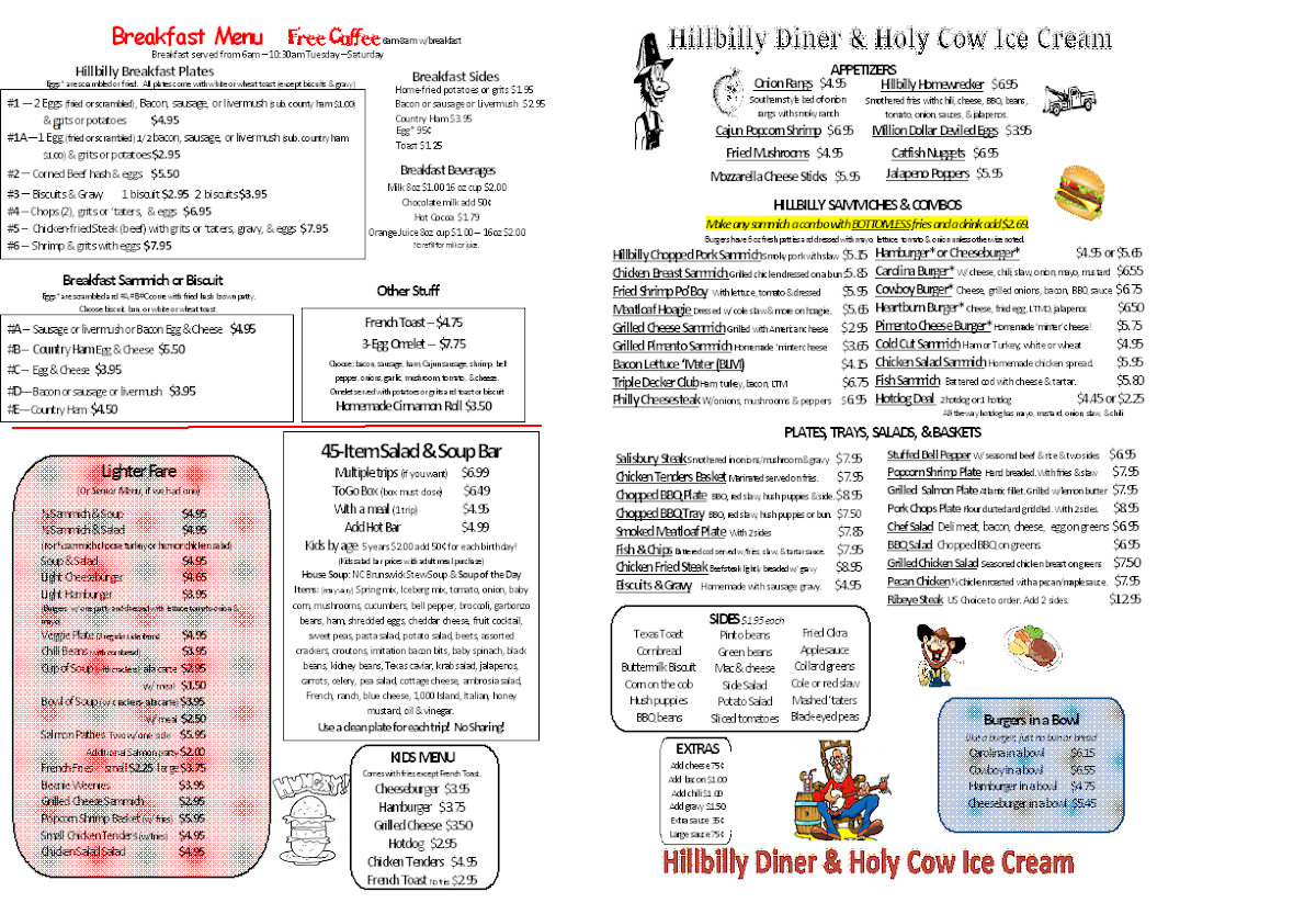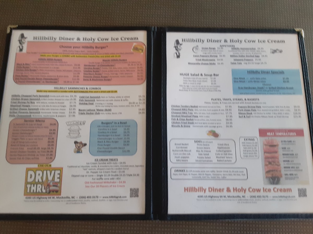 Hillbilly Diner & Holy Cow Ice Cream Menu (Update 2025)