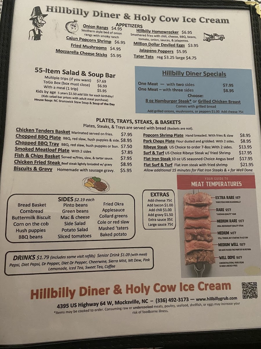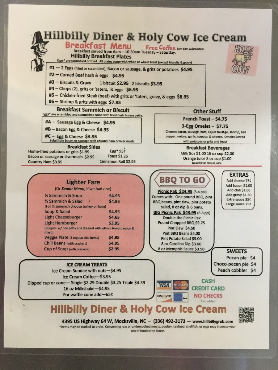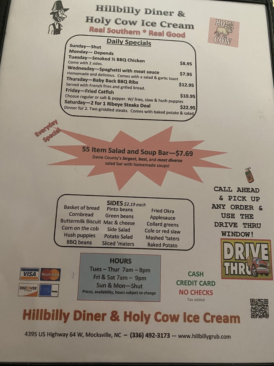 Hillbilly Diner & Holy Cow Ice Cream Menu (Update 2025)
